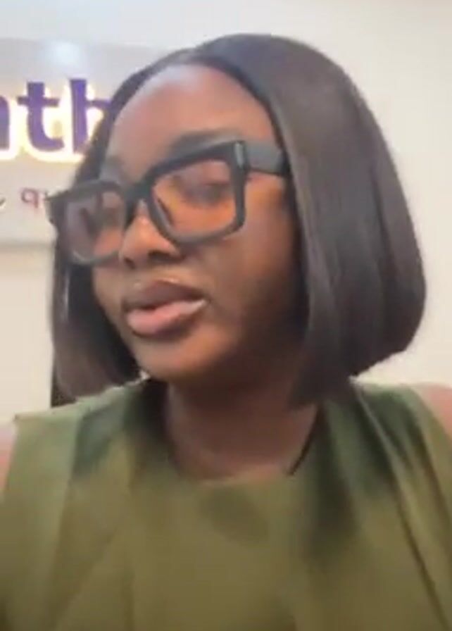 A woman with short dark hair and glasses is looking directly at the camera. She is wearing a sleeveless green top. The background is white with a sign on the wall partially visible. The sign is purple and includes the word "health". The woman's mouth is slightly open.