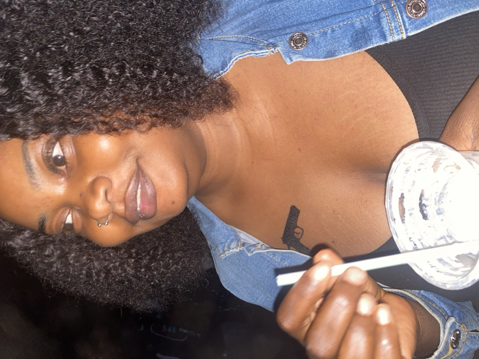 A woman with curly hair, a nose ring, and a blue denim jacket is holding a straw and a cup with remnants of a white substance, possibly a smoothie. She has a tattoo of a handgun on her upper chest. The woman appears to be smiling slightly, and the image is taken at an angle, with the camera positioned slightly above her.