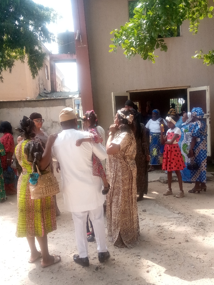 The image depicts a social gathering of approximately fifteen to twenty individuals in an outdoor, unpaved courtyard in Lokoja, Nigeria