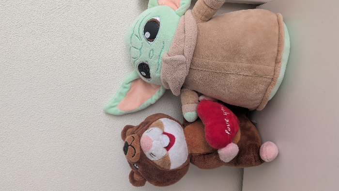 - "Two plush toys are displayed on a flat, light-colored surface against a textured, light off-white wall" by FM-btFon2, licensed under CC BY 4.0