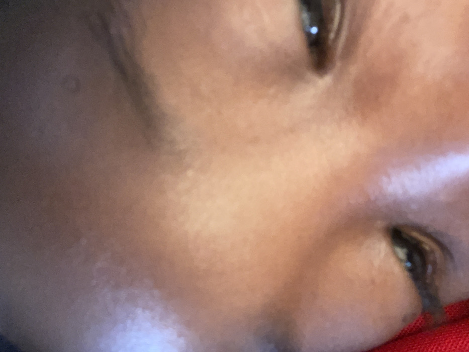 The image presents an extreme close-up view of a human face, specifically focusing on the forehead and eye areas. The scene is located in Barakin Akawo, Nigeria. The individual's skin tone is dark or reddish-brown. Visible features include a smooth forehead and parts of two dark eyebrows. The upper portions of both eyes are visible, with dark irises reflecting a small, bright light source in each pupil. A section of red fabric, likely an item of clothing, is partially visible along the lower left edge of the frame. The image exhibits soft focus and a shallow depth of field, with no discernible actions, interactions, or additional subjects or objects. The environment is indistinct but appears to be an interior setting based on the light reflections.