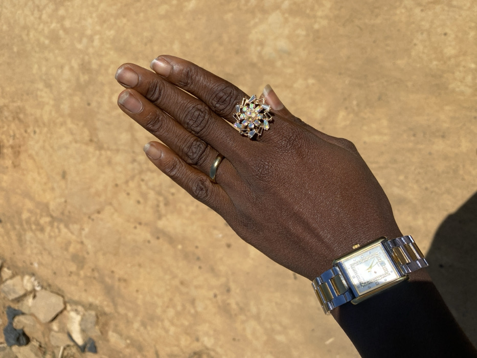 A close-up photograph depicts a dark-skinned human left hand positioned against a light brown, earthy background consistent with dry soil or sand. The hand is adorned with a plain gold-colored band on the ring finger and a prominent, multi-stone ring, possibly set with opals, on the index finger. A rectangular wristwatch with a two-tone (silver and gold-colored) metal strap is worn on the wrist. The fingernails are visible, appearing natural and unpolished. Scattered small, dark rocks are present in the upper left portion of the background. The scene is illuminated by direct sunlight, casting a shadow from the hand onto the ground. The image is situated outdoors in Jos, Nigeria.