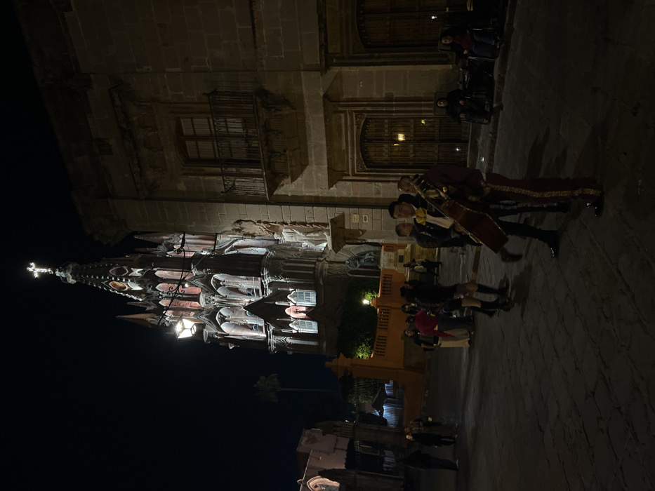 A nighttime scene features a brightly lit church steeple with a cross at its peak. A stone building flanks the steeple. In the foreground, a mariachi band is performing; the musicians are dressed in traditional attire. People gather on the cobblestone ground, some seated. The scene is illuminated by a combination of artificial lighting and the ambient glow of the night.