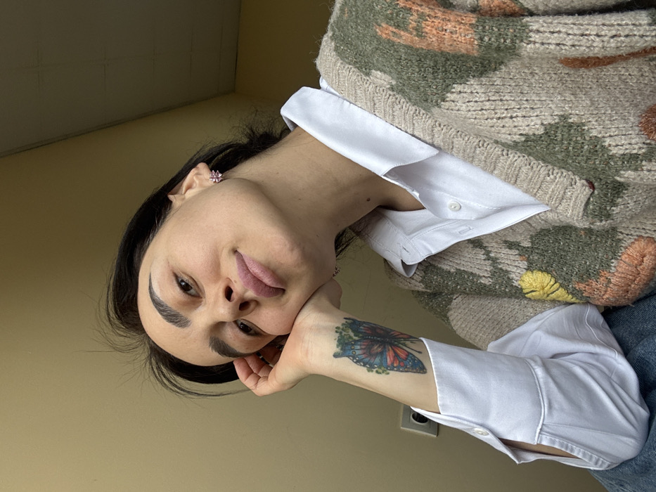 The image is a close-up indoor portrait of an individual identified as female, positioned facing the camera with a slight upward angle and a faint smile. Her dark hair is casually styled, complementing her well-defined eyebrows and full lips colored with a light pink/nude shade. She wears a white collared shirt layered under a V-neck knit sweater featuring an abstract pattern in beige, olive green, peach, and yellow. A pink stud earring is visible in her right ear. Her left hand supports her head, resting against her cheek, revealing a prominent colorful butterfly tattoo on her inner forearm/wrist, detailed with blue, red, orange, and green elements. The background is a plain, light brown wall. A white Type F electrical outlet with two circular sockets and a grounding pin is visible on the wall in the lower-left quadrant. This indoor setting is located in Tbilisi, Georgia, as per the provided information.