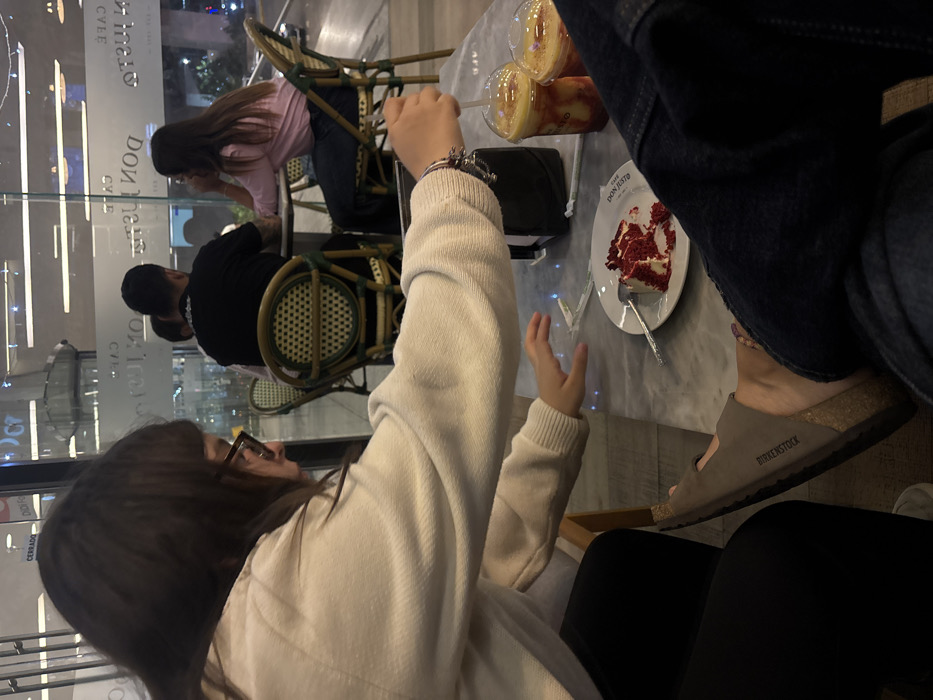 Inside a cafe, a group of people are seated at a marble-topped table. There are two glasses of blended fruit drinks, a plate with a slice of red velvet cake, and a small black purse. One person wears a white sweater and another wears dark denim jeans and Birkenstock sandals. A third person is in a pink shirt, and a fourth wears a black shirt. The cafe has large glass windows.