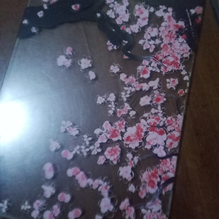- "A top-down, slightly oblique view captures a flat, reflective surface, likely a table, adorned with a repeating pattern of stylized pink and red floral motifs resembling cherry blossoms against a dark, possibly black or deep brown, background" by FM-qjhjS2, licensed under CC BY 4.0