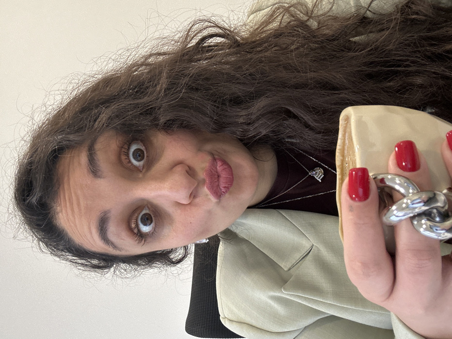 A woman with curly dark hair, wearing a tan blazer and a maroon shirt with a silver heart necklace, makes a silly face with wide eyes and pursed lips. Her red manicured nails are visible on her hand, which is holding a tan purse with a large silver chain handle. The picture is tilted at an angle.