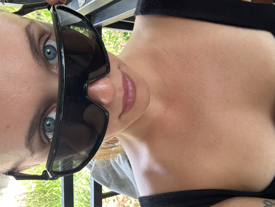 The image displays a close-up, chest-up view of a female individual, located in Choeng Thale, Thailand. She has fair skin, blue eyes, and light-colored hair, visible at the sides of her head. Her gaze is directed straight at the viewer. She is holding or wearing large, black, wrap-around sunglasses just below her eye line, allowing her eyes to be fully visible above the frames, while the top of her nose and bridge of her nose are obscured. Her lips, visible below the sunglasses, are slightly parted and appear to have a light pink or mauve tint. She is dressed in a black tank top with thick straps visible on both sides. A portion of a tattoo, resembling a tree or root system, is discernible on her inner left upper arm. The background consists of green foliage and dark, vertical and horizontal structural elements, suggesting an outdoor setting such as a balcony or patio.