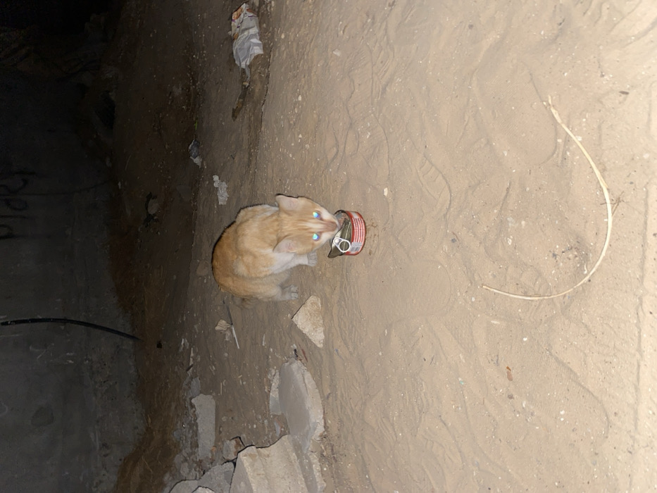 The image depicts an orange and white cat eating from an open red and silver can of food on a sandy ground in what appears to be a dimly lit or dark outdoor/sheltered area in Khan Yunis, Palestinian Territory