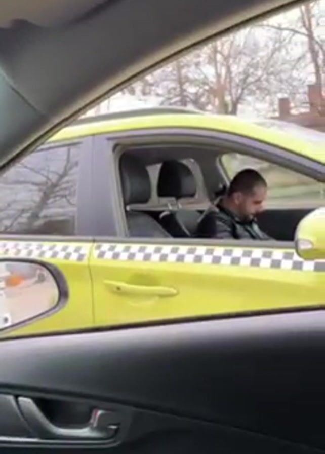 The interior of a car, specifically the driver's side door, is shown in the video. A bright yellow car is visible through the driver's side window. The yellow car has a checkered pattern design along its side. Inside the yellow car, a man with dark hair and a beard is seated in the driver's seat. He appears to be looking down at something in his lap. The background behind the yellow car includes leafless trees and a building.