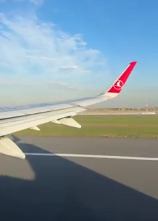 wing of a Turkish Airlines plane on a runway, against a backdrop of a blue sky and patchy white clouds