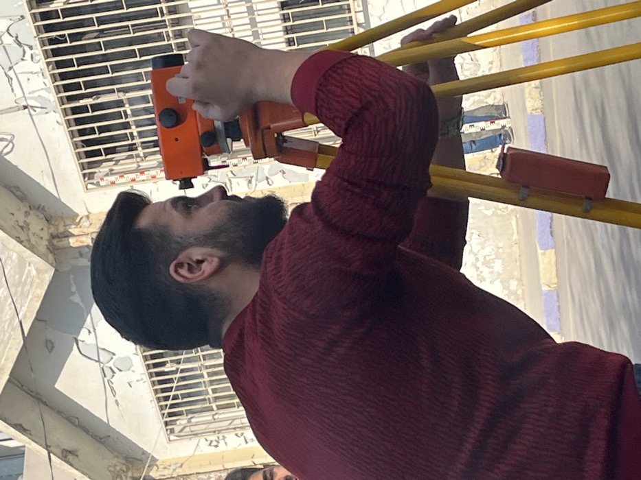 A male individual with dark hair and a beard, wearing a maroon textured sweater, is seen in profile, operating an orange optical leveling instrument mounted on a yellow tripod. He is looking through the instrument, with his right hand positioned on an adjustment knob. A red pouch is attached to one of the tripod legs. The scene is outdoors on a paved surface, likely a street or sidewalk, with a curb featuring purple and light yellow markings. In the background, there is a weathered, light-colored building with peeling paint or stucco and multiple windows secured by light-colored metal grates. Partially visible in the distance, another individual's lower legs are visible alongside a white leveling staff displaying E-pattern markings, suggesting ongoing surveying work. The event occurs in Al-Qanawat Municipality, Syria, under bright daylight conditions.