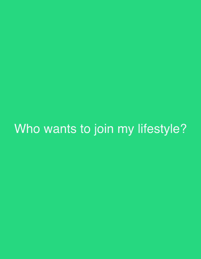 A vibrant green background fills the frame. Bold, white text poses the question, "Who wants to join my lifestyle?" The text is centered horizontally and placed in the lower half of the image. The overall composition is simple, with the text standing out against the uniform background.