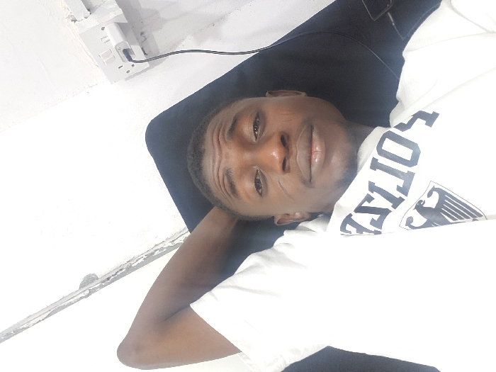 A young man reclines with his head resting on a dark cushion, positioned on a light surface near a wall