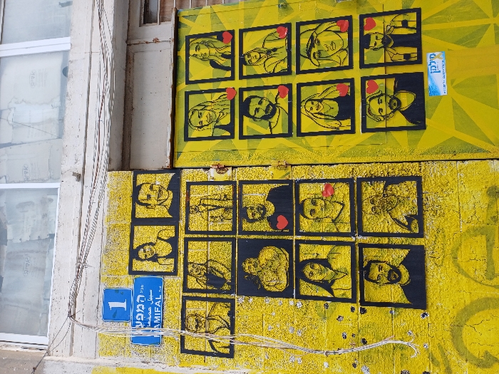 The image displays a bright yellow-painted wall and an adjacent yellow metal door at Hameifil Street number 1, Tel Aviv, Israel, as indicated by a blue street sign on the left wall. The wall exhibits peeling paint and a textured surface, while the door features geometric patterns in a slightly darker yellow or green. Above, a gray concrete facade with two windows covered by white material is visible. A white cable runs diagonally down the left side of the wall. The primary subjects are 20 stylized portraits rendered in black outline on a yellow background, affixed or painted onto the wall and door. On the left wall, 12 portraits are arranged in three columns and four rows. They depict diverse individuals, including smiling men and women, an older man with glasses, a woman holding a baby, and others with various facial hair and expressions. Two of these portraits, depicting men, feature a small red heart placed on the chest area. On the right door, eight portraits are displayed in three columns and three rows, with the bottom-right position occupied by a yellow sticker containing Hebrew text "מילמן" (Milman). These portraits primarily show individuals, mostly smiling, with a small red heart placed either near the chin or on the chest area in all eight instances. The artwork consistently uses a simple, bold style, resembling stencil art or murals. The collective display, featuring multiple individuals and the recurring red heart motif, suggests a commemorative or tribute purpose.