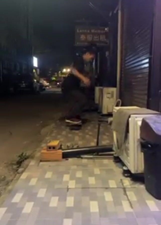 At night, a man skateboards on a sidewalk. He wears a black t-shirt, dark pants, and red and black shoes. He is facing towards the street and away from the camera. The sidewalk is paved with gray and white patterned tiles. To the right, a building with closed metal shutters is lined with air conditioning units and a black trash can. To the left, the street is visible with cars parked along the curb. There is a sign that says "Lanna Memories" and some Chinese characters above the storefront. The man attempts a skateboarding trick off a low brick obstacle, briefly flying off his board.