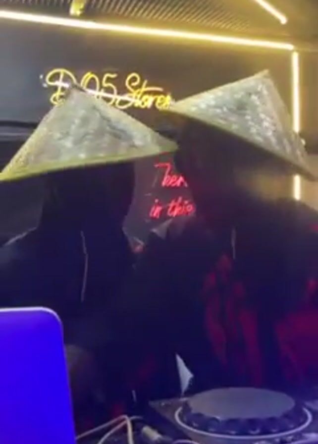Two DJs wearing black hoodies with red designs and conical straw hats are performing at a venue with a “D05 Stores” neon sign