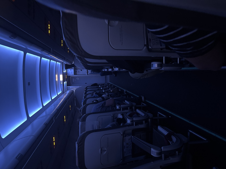 An airplane interior shows reclining passengers in dim, bluish light. Rows of seats are visible, along with the airplane's windows, each illuminated with a soft blue glow. Overhead compartments and control panels line the upper area. The image is oriented as if the viewer is looking upward within the plane. The general atmosphere is peaceful and subdued, suggesting a long journey.