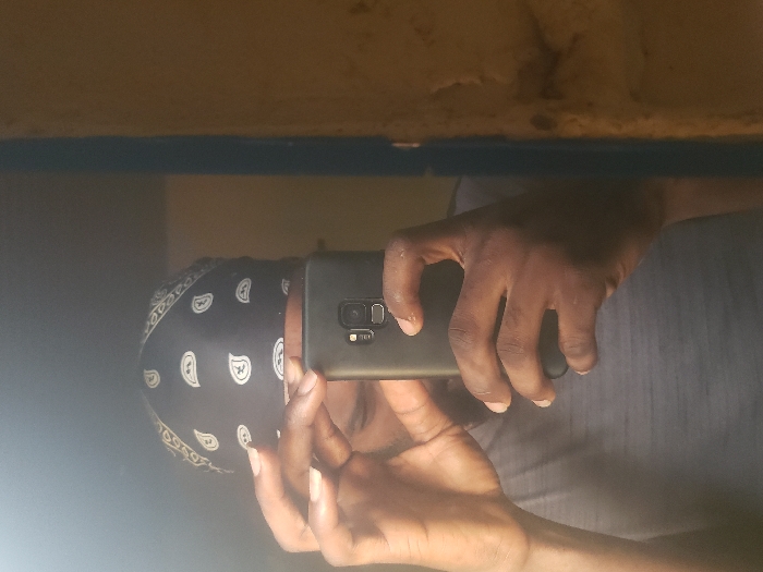 A selfie captures a person in a grey shirt and patterned bandana taking the photo