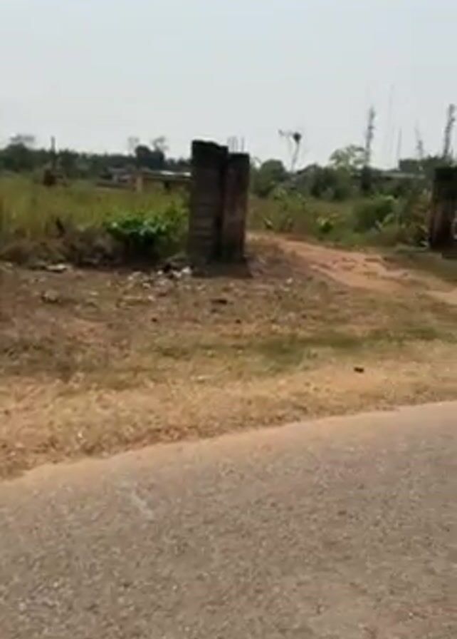 road in a rural area. The road is paved, but slightly worn. On either side of the road is overgrown grass and dirt. There are sparse trees and bushes in the background. A set of unfinished concrete pillars are visible off the side of the road. The camera is moving along the road, possibly in a vehicle. A person is briefly visible at the edge of the frame. The sky is overcast.