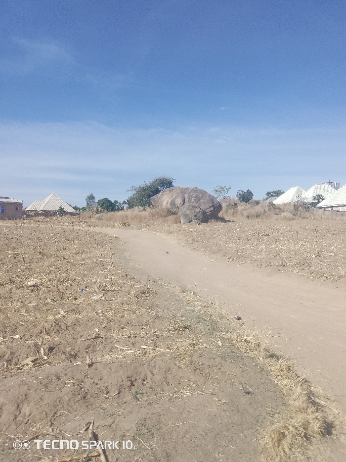 An outdoor scene captured under clear blue skies depicts a dry, open landscape traversed by a dirt path. The foreground consists of light brown, parched earth with scattered remnants of dried vegetation and plant stalks. A narrow, unpaved dirt path curves from the lower right of the frame, moving towards the center-left and receding into the background. In the midground, to the right of the path, a large, smooth, dark grey boulder rests on a slight elevation, accompanied by a smaller rock at its base. Behind these rocks, several green trees and bushes are visible. In the background, various structures are present: to the far left, a section of a reddish-brown brick building with a dark roof is partially visible. Towards the center-left, a building features a light-colored, conical or pyramidal roof. Further to the right, a cluster of several buildings with distinctive white, conical or pyramidal roofs stands against the horizon. No individuals or animals are present. The environment suggests a dry season or arid climate in the city of Unknown, Unknown.