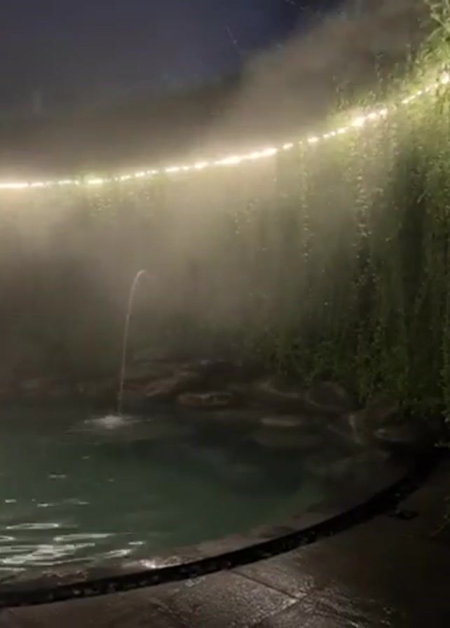 dimly lit outdoor pool at night. The pool is surrounded by greenery, with what appears to be vines hanging down and a row of warm white string lights accentuating the edge. Steam or fog is rising from the pool, partially obscuring the view. A small fountain is visible in the pool, spouting water upwards. The camera pans slightly to the right, revealing a paved walkway around the pool. There is no clear indication of any people in the video.