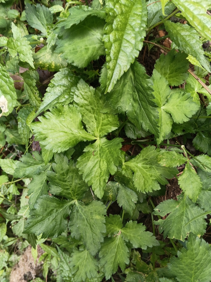 The image displays a dense patch of green foliage, presumably growing on the ground in Buyantashi, Zambia. The primary subjects are numerous broad leaves exhibiting various shades of green, from light to dark. Many leaves feature distinct venation, serrated edges, and a multi-lobed or palmate-like structure. Some leaves appear slightly glossy or wet, suggesting recent moisture. Patches of dark brown soil and dried organic matter are visible beneath and between the plants, particularly towards the edges of the frame. There are no people, animals, man-made objects, or discernible actions present in the scene. The overall environment is natural and vegetative.