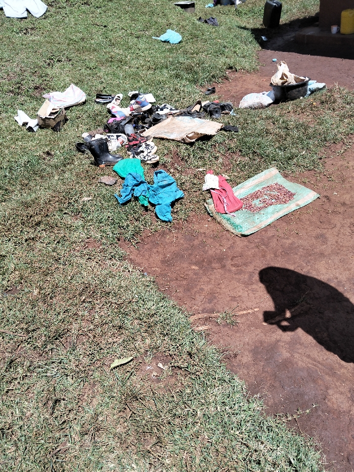 The scene is an outdoor area in Nyansiongo ward, Kenya, featuring a ground composed of patchy green grass and exposed reddish-brown soil, illuminated by direct sunlight which casts distinct shadows. In the midground, a large assortment of footwear, including sneakers, sandals, and a black rubber boot, is clustered on the grass, intermixed with various pieces of clothing and fabric. To the immediate right, a crumpled blue garment rests on the ground. Further right and closer to the foreground, a folded red garment lies on a light green woven mat or sack, which is spread with a quantity of small, red-brown granular material, consistent with beans or coffee beans, presumably for drying. In the lower right foreground, a clear shadow of a person holding a mobile phone is cast on the reddish-brown soil. In the background, near a darker, possibly structural element, a black jerrycan, a yellow plastic container, and a dark basin containing lighter-colored material are visible. Other scattered items, including light-colored fabric or packaging, are present on the grass in the background. No individuals are directly visible.