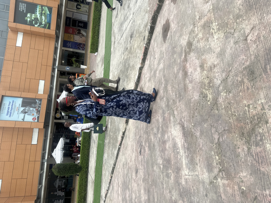 The image depicts an outdoor pedestrian area in Itirin, Nigeria, in front of a multi-story commercial building prominently featuring "LANDMARK" branding. The building's upper facade is paneled in a light brown hue, while the ground level has large glass windows and entrances. Several large advertising banners are affixed to the building, one promoting "Upgrade Your Hotel Experience" and another displaying a layered cake. In the foreground, an adult Black woman with dreadlocks and red-framed glasses walks from right to left, wearing a long, dark blue floral-patterned dress, blue flat shoes, and a lanyard with an ID badge. She carries a dark shoulder bag and holds a white object in her right hand. Behind her, two adult men of South Asian descent walk in the same direction, both wearing blazers or collared shirts, trousers, and lanyards with badges. Further to the left, an adult man in a white traditional Nigerian outfit carries a dark green bag. Additional figures are visible in the background, some seated at white picnic tables with umbrellas, located on a paved area beyond a strip of artificial green turf. The ground in the foreground is a textured concrete or paved surface with visible wear and discoloration.