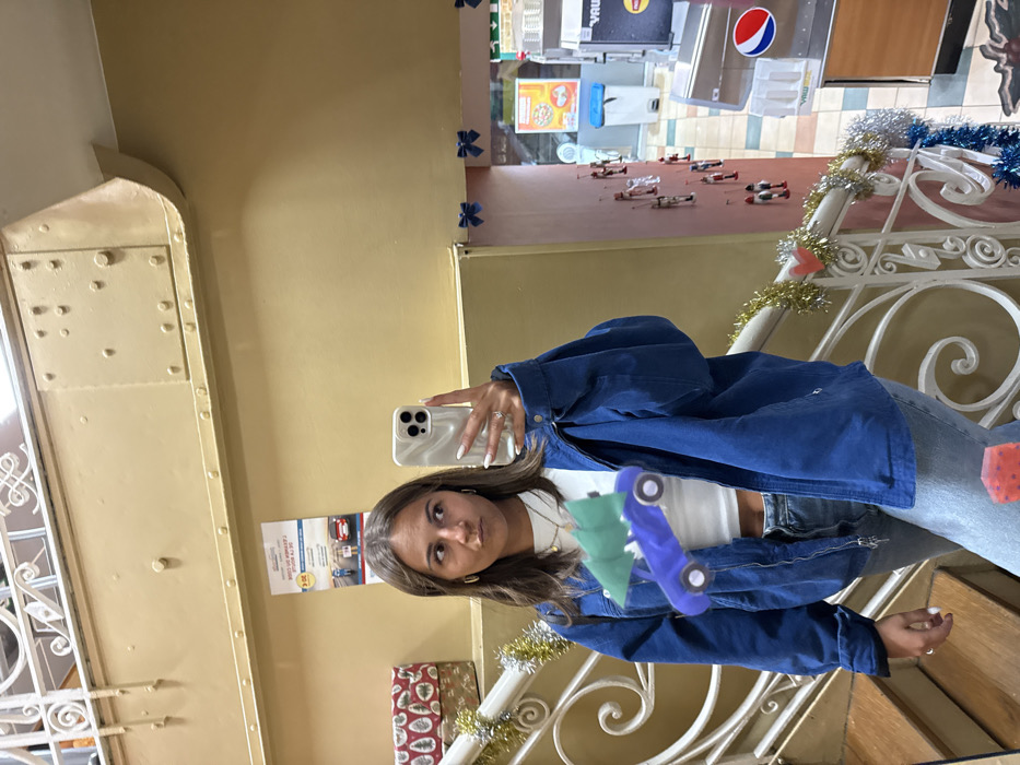 A young woman stands in front of a mirror, holding a phone and taking a selfie. She is wearing a white top and a dark blue jacket. Ornate metalwork is behind her, decorated with Christmas tinsel. The mirror reflects the interior of what appears to be a commercial space, showing signs, a Pepsi logo, and small toy airplanes lined up on a counter. Gifts wrapped in festive paper are stacked on a shelf, and there is a poster hanging on the wall.
