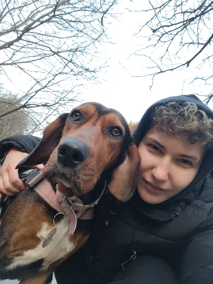 This image captures a close-up selfie of one person and one dog outdoors, in what appears to be a park or wooded area within the city of Veliko Tarnovo, Bulgaria, though no specific landmarks are identifiable. One individual, a young adult with short, curly brown hair visible under a dark, possibly black, hooded puffer jacket, is positioned on the right. Their left hand (from the viewer's perspective) is visible, resting on the dog's back or shoulder near a dark-colored buckle mechanism. The person's face is directed towards the camera with a neutral expression. One dog, a medium-sized breed with characteristics of a hound (e.g., long, droopy ears), occupies the left and central portions of the frame. Its coat is predominantly brown/reddish-brown with black markings on its head and ears, and white fur on its chest. The dog wears a light pink fabric collar with a silver-colored ring and a hanging silver-colored dog tag. The dog's head is tilted slightly upwards, and it looks directly into the camera with dark eyes. The background consists of numerous bare tree branches silhouetted against an overcast, light grey sky, suggesting a cold season such as late autumn or winter. The overall scene indicates an outdoor activity involving the person and the dog.