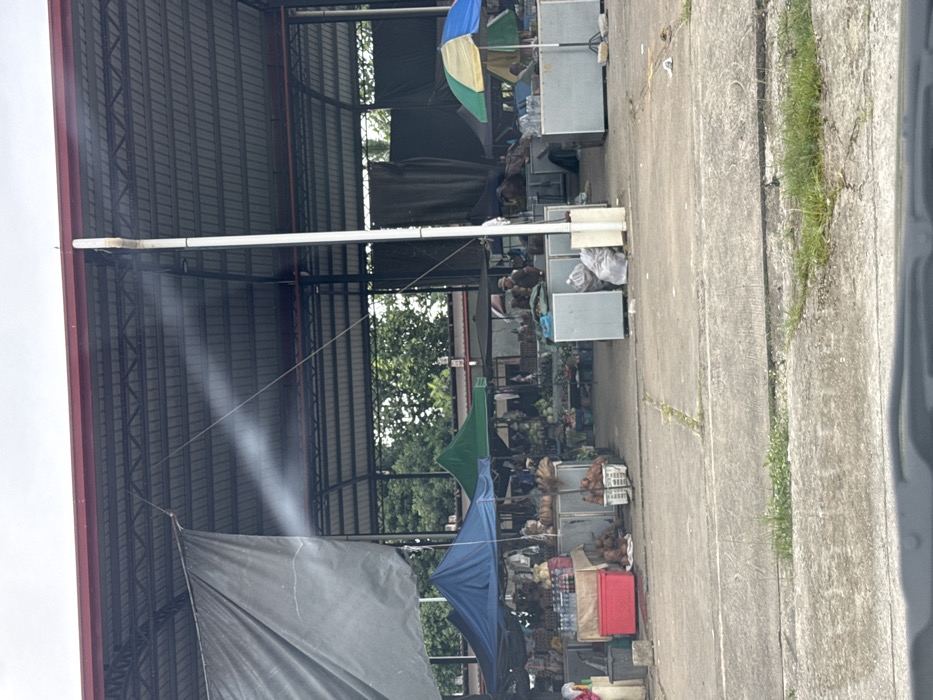 A bustling open-air market scene under a large metal roof. Vendor stalls line the concrete ground, covered by colorful umbrellas and tarps. Vegetables, coconuts, and various goods are displayed. Some vendors and shoppers are visible amidst the stalls. Natural light streams through the roof's gaps. Patches of grass grow along the concrete edge, adding a touch of nature to the urban setting.
