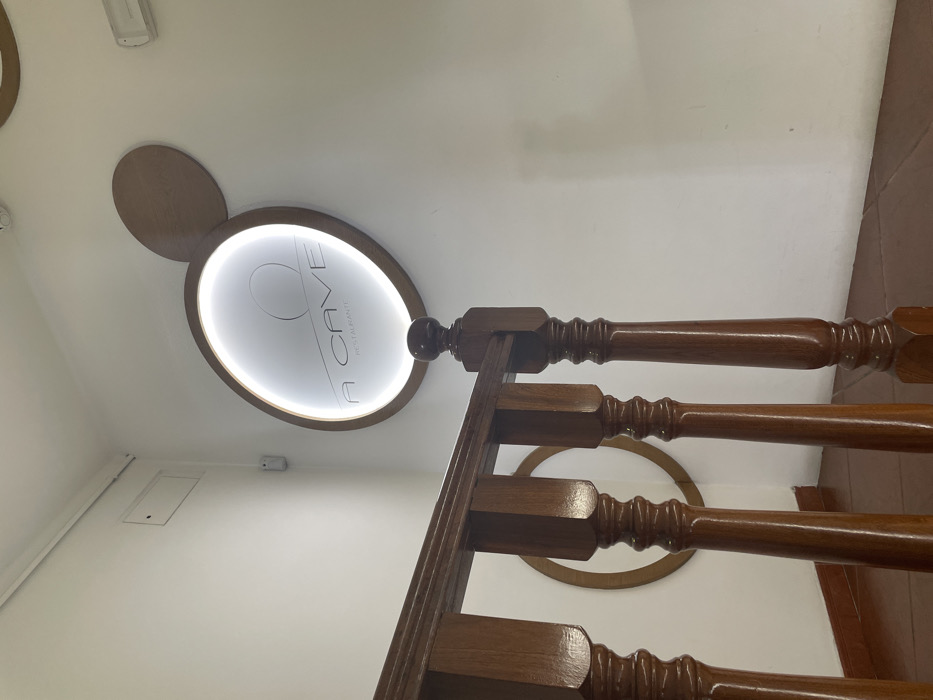 The image displays the interior of A Cave Restaurante, located in Fátima, Portugal, viewed from a low angle. In the foreground, a polished dark brown wooden staircase railing and several balusters ascend diagonally from the lower left towards the upper right. The balusters feature turned decorative elements. The main subject is an illuminated circular sign mounted on a white wall in the midground. The sign has a wooden frame and displays "A CAVE" in large sans-serif letters with "RESTAURANTE" beneath it, all in dark lettering against a brightly lit white circular background. A smaller, unlit, dark wooden circular shape is attached to the upper right perimeter of the main sign. Below and slightly behind the main sign, partially obscured by the staircase balusters, another unlit, plain dark wooden circular frame is visible on the white wall. The surrounding walls are painted white. A rectangular access panel and a small white wall-mounted sensor are visible on the upper left wall. The floor visible below the staircase consists of reddish-brown tiles. No individuals are present in the scene.