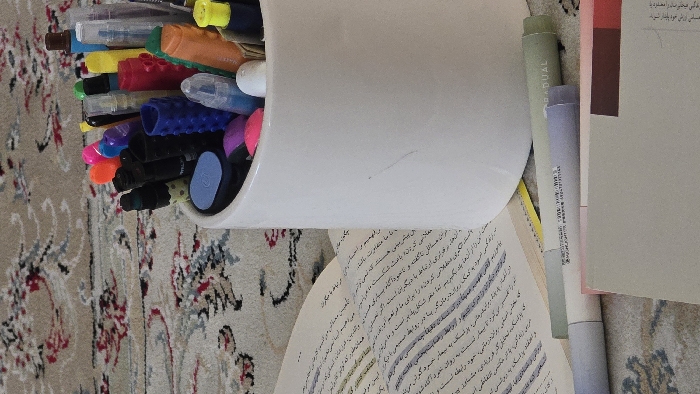 white ceramic cup filled with various writing utensils, including pens, pencils, highlighters, and markers. The cup is situated on a patterned rug with an open book lying on the rug to the left of the cup. The book is written in Persian. The writing implements are arranged haphazardly in the cup. The scene is likely from a home or study in Gorgan, Iran, as the coordinates provided (latitude: 36.822, longitude: 54.456) are for the city. There is no one present in the scene. The image has a natural light source, highlighting the various colors of the writing implements. The image has a soft focus and a shallow depth of field. The overall tone of the image is calming and quiet.