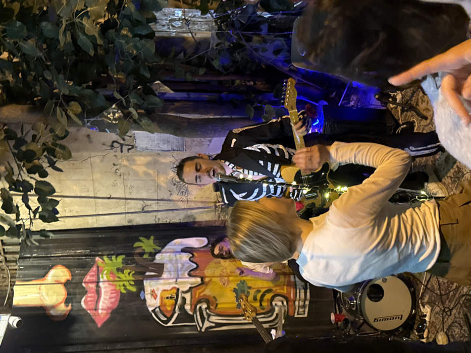 This image captures a live music performance in an urban, semi-outdoor setting at Kuli Alma, a bar and music venue located at Mikve Israel 10, Tel-Aviv, Israel