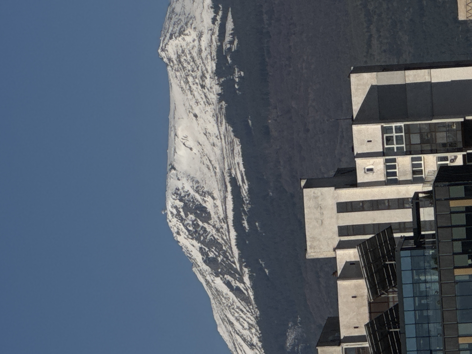 snow-covered mountain range, likely Vitosha Mountain, next to modern buildings, possibly in a district of Sofia, Bulgaria