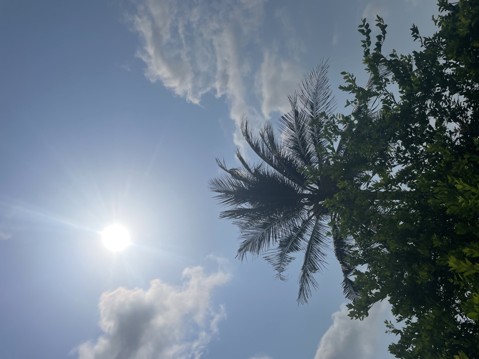 The image displays a bright outdoor scene in Mosafejaw, Nigeria, under direct sunlight. A brilliant, intensely bright sun, exhibiting prominent starburst light rays and lens flare, is positioned in the upper-left quadrant of a clear, light blue sky. Scattered white cumulus clouds are visible, primarily in the upper-right and mid-left areas. In the lower half of the frame, the upper portion of a tall, dark green coconut palm tree is visible, its fronds distinctly silhouetted against the bright sky. Beneath and to the left of the palm, the dense, lighter green foliage of another unidentified broadleaf tree fills the lowest section of the image. No individuals or man-made objects are present in the frame.
