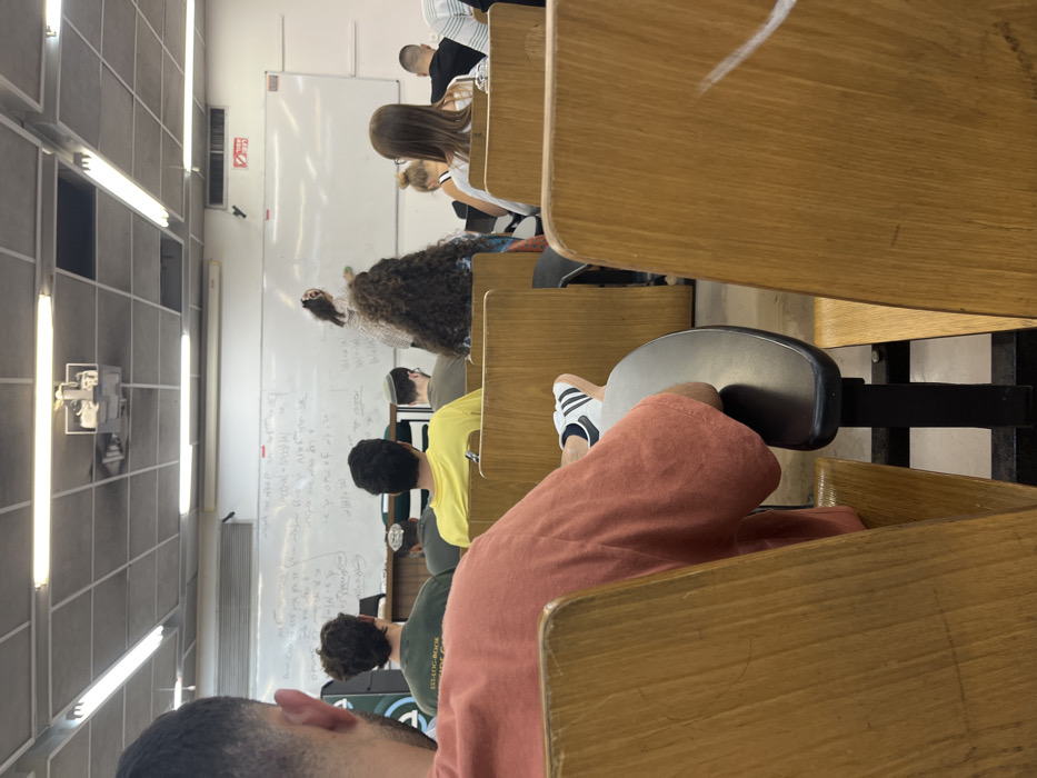 The image depicts a classroom or lecture hall in Givat Shmuel, Israel, viewed from the perspective of a seated student