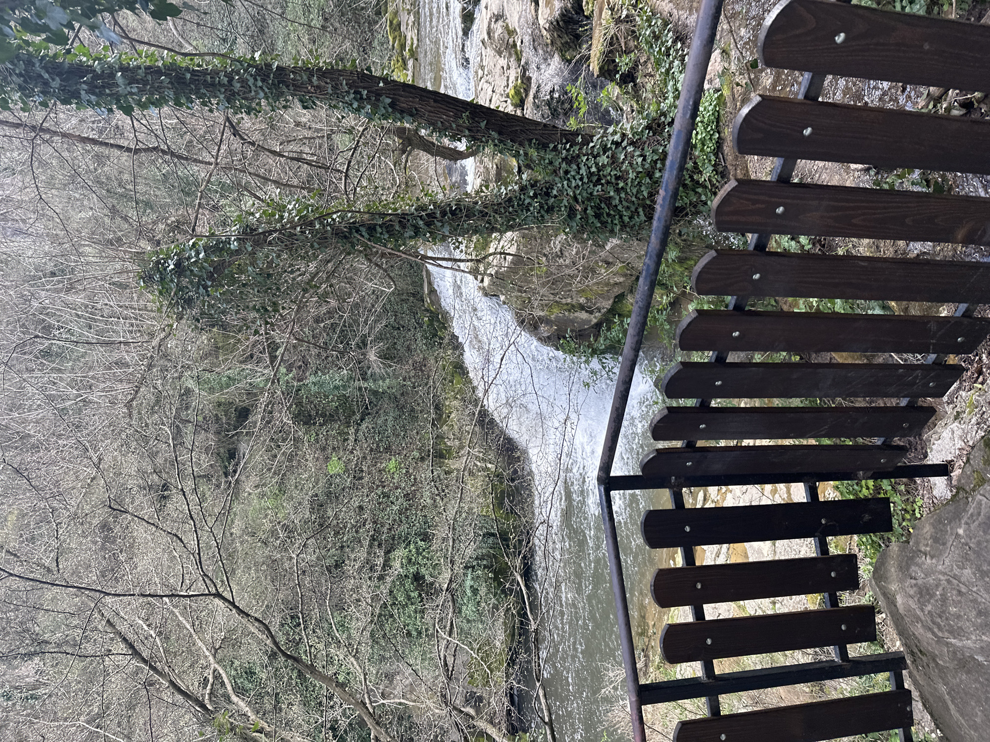 The image captures a view from a set of wooden stairs with a metal railing, overlooking a small waterfall in Lesicharka, Bulgaria. The waterfall cascades down a rocky slope into a river. The surrounding vegetation includes bare trees and green foliage. The photograph is taken from a high angle, looking down at the waterfall.