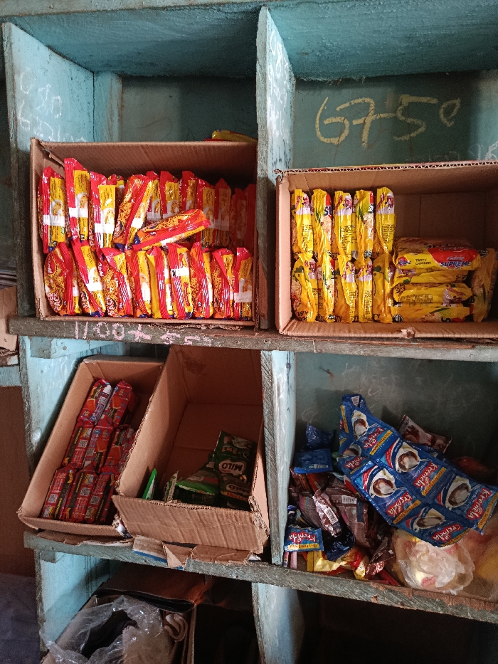 The image depicts a section of a multi-compartment wooden shelving unit, painted a faded light blue, located in Akwanga, Nigeria. The unit displays various packaged consumer goods. Specifically: * The top-left compartment contains an open cardboard box filled with numerous individually packaged items, predominantly in red and yellow foil-like wrappers. * The top-right compartment holds an open cardboard box containing yellow-packaged instant noodles, including vertically stacked "Star" brand items and horizontally stacked "Tasty Chicken Supreme" brand packs. The numbers "67-50" are chalked in white on the back wall of this compartment. * The middle-left compartment contains an open cardboard box filled with stacked, individually red-wrapped items. * The compartment immediately to its right holds an open cardboard box containing multiple green and white "MILO" brand instant chocolate malt drink sachets. * The middle-right compartment contains a loose collection of individually packaged items, prominently featuring blue "Kremela" brand coffee creamer sachets, intermingled with other wrappers and a crumpled white plastic bag. * Faint white chalk markings, including "1100++", are visible on the wooden structure below the top-left compartment. * The wooden shelves exhibit signs of wear and chipped paint. No individuals are present in the scene.