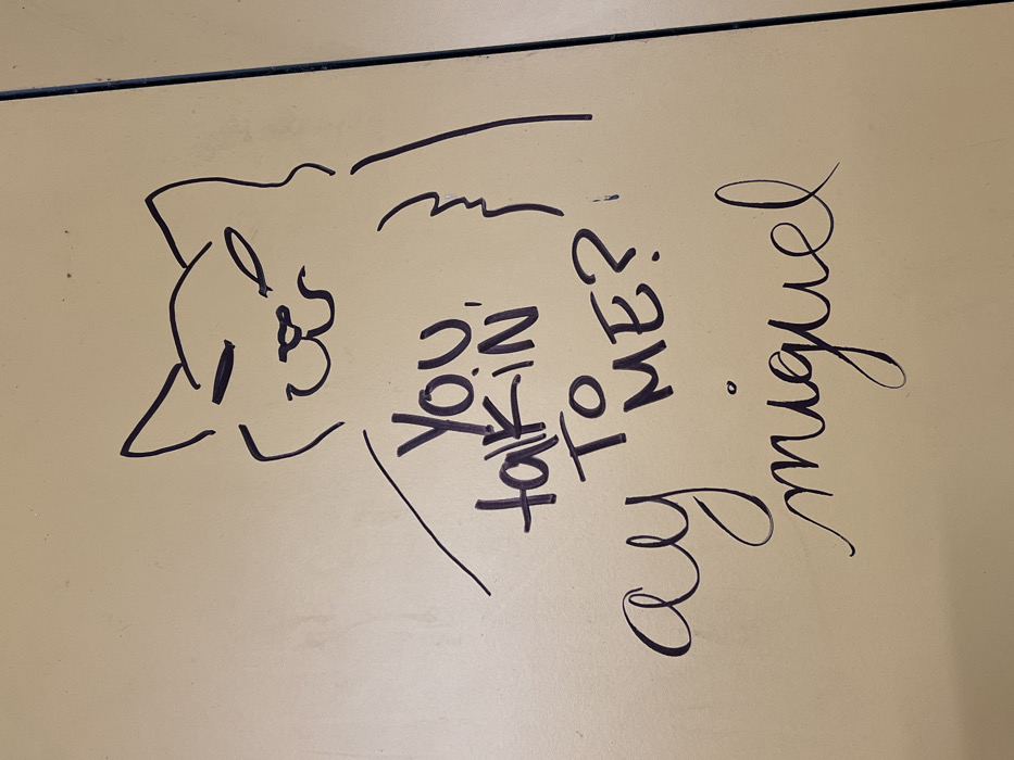 The image displays a light tan surface, likely a wall panel or laminated board, featuring black marker graffiti. A stylized, minimalist drawing of a cat's head and upper torso occupies the right and central areas, characterized by narrowed eyes and a slight smile, conveying a smug or mischievous expression. To the left and slightly below the cat's head, the phrase "YOU talkiN' TO ME?" is inscribed in black, somewhat uneven block letters. Below this, the words "ay miguel" are written in black cursive script, appearing as a signature or additional comment. A distinct vertical seam is visible along the right edge of the depicted surface. This scene is located in Vilanova i la Geltrú, Spain.