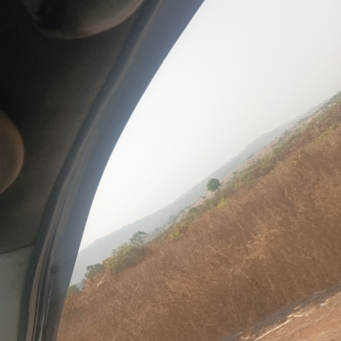 The image depicts an exterior landscape viewed obliquely from inside a vehicle, located in Assob Hausa, Nigeria