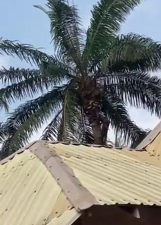palm tree partially obscured by a building with a corrugated metal roof. The tree is tall with long, green fronds reaching into the blue sky. A small sign with the number "10" is visible on the trunk of the palm tree. The building's roof is tan or beige with some areas appearing darker, possibly due to weathering. The camera angle looks upward, emphasizing the height of the tree and the building's low profile. The sky is mostly clear. The general setting seems to be a rural or tropical area.