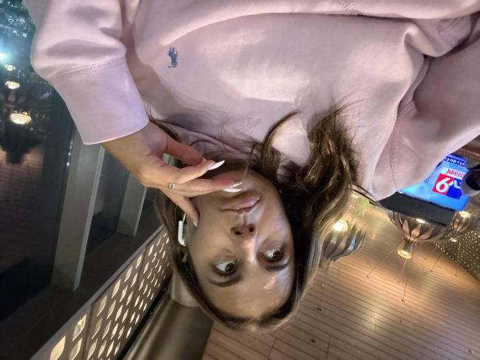 A woman in a pink Ralph Lauren sweatshirt poses indoors. She wears white AirPods and a ring. Her brown hair is tousled around her face. Her gaze is directed upwards. A table with a television displaying "TODAY 9" and a cup is visible. The background features modern architectural details with a wooden floor and decorative light fixtures. The image has been rotated, placing the subject at an unconventional angle.