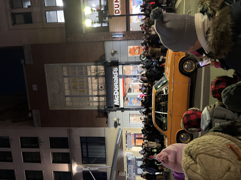 A large crowd lines a city street at night. A vintage orange car is on the street, seemingly part of a parade or event. McDonald's and Dunkin' Donuts are visible storefronts. The buildings are a mix of brick and lighter materials, with ornate window details on one building. Some crowd members are wearing winter hats.