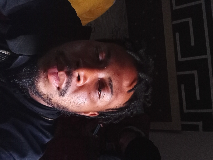 - "An indoor, eye-level close-up depicts a male individual with dark skin, dreadlocks, and a beard, looking directly at the camera" by FM-32TDI3, licensed under CC BY 4.0