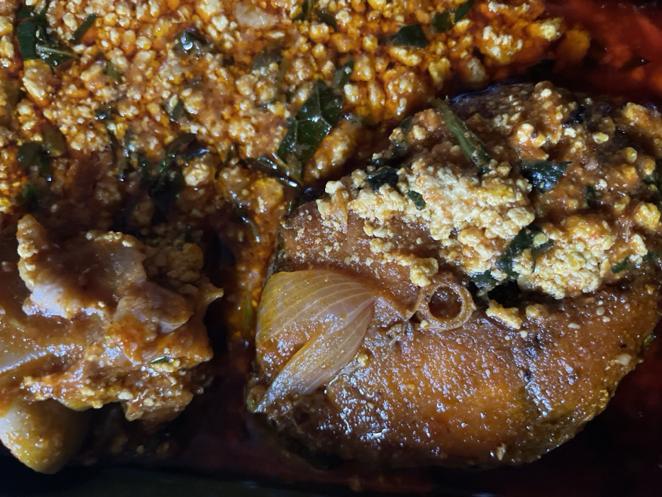A close-up image displays a cooked meal prepared in Narayi, Nigeria. The scene features a large, reddish-brown piece of fish, topped with a translucent light brown onion slice, resting within a rich, reddish-orange stew. A portion of a lighter-colored cooked meat item is visible at the top left. The stew and exposed surfaces of the proteins are heavily textured with numerous yellowish-white granular particles and scattered dark green leafy vegetables. A prominent oily sheen is visible across the stew's surface. The food is contained within a dark vessel, the edges of which are visible.