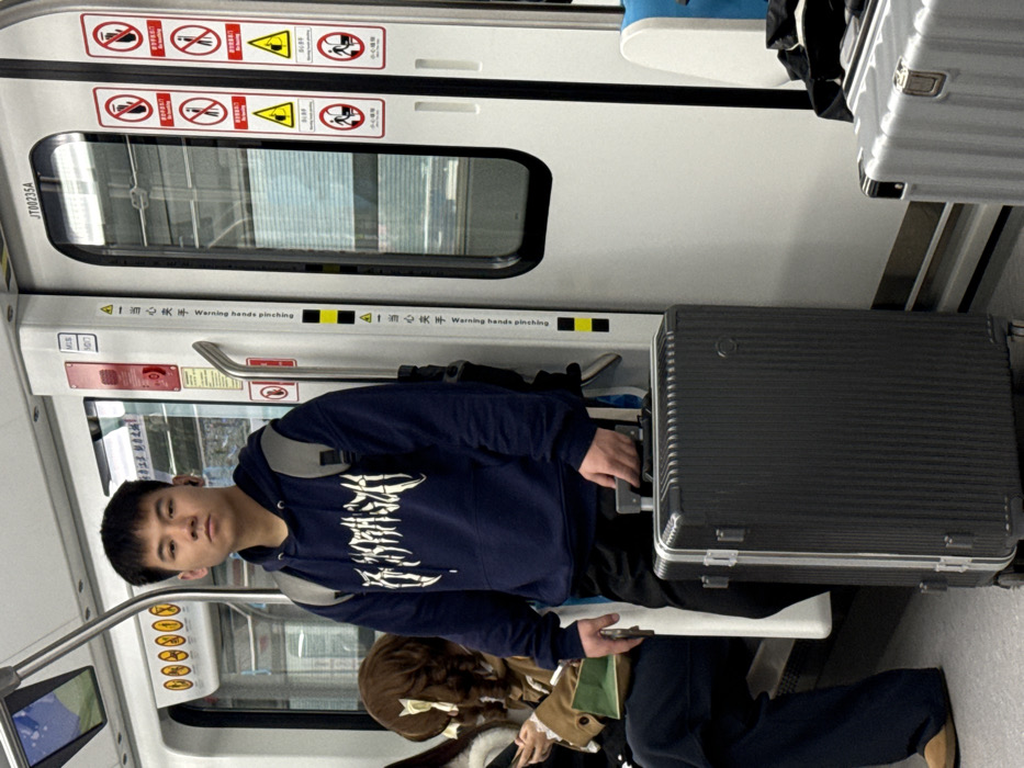 The image depicts the interior of a subway train in the city of Tiaodeng, China. A young East Asian male, approximately mid-20s, stands centrally, facing forward with a neutral expression. He wears a dark blue hooded sweatshirt with a stylized white graphic text, "THRASHGA," on the front, black trousers, and a light grey backpack. A black in-ear earbud is visible in his right ear. He holds the extended handle of a dark grey, ribbed, hard-shell rolling suitcase with silver metallic accents in his right hand. To the left, a second individual is partially visible, seated, with long brown hair adorned with a light-colored bow-shaped clip. This person wears a brown jacket and dark trousers, appearing to be engaged with a smartphone. The subway car interior features white walls and doors with dark-framed windows. Various red, yellow, and black warning and prohibition decals are affixed to the doors and the white panel between them, including "Warning hands pinching" in both English and Chinese characters. A silver, ribbed, hard-shell rolling suitcase is partially visible on the floor to the right of the primary subject. A silver vertical handrail is positioned to the primary subject's left.