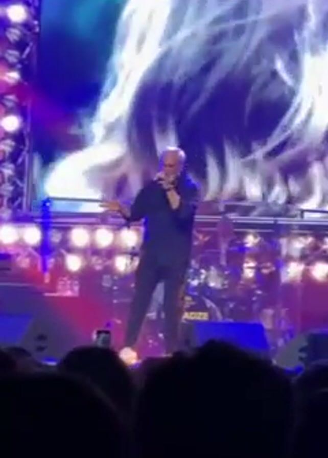 A man is singing on a stage. He has gray hair and a beard. He's wearing a dark outfit and white shoes. He gestures with his hands as he sings into a microphone. Behind him is a large screen with abstract patterns. There are stage lights above and around the screen. The band "ADZE" is behind him. The audience is in the foreground, mostly in shadow, with some people holding up phones.