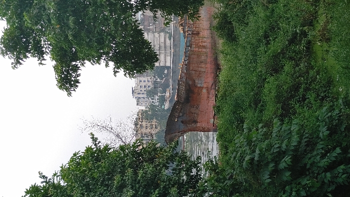 This image depicts a static scene along a waterway in Narayanganj, Bangladesh. In the mid-ground, a large, derelict ship's hull, characterized by significant rust with reddish-brown and dark grey coloration, rests partially submerged in murky, grey-green water. The ship's bow points towards the left of the frame. The immediate foreground and sides are dominated by dense green foliage, including tree branches framing the upper left and right, and abundant lower shrubs covering the riverbank. A small patch of green, possibly stagnant, water is visible among the vegetation in the lower right quadrant. In the background, across the water, a series of multi-story urban buildings with varied architectures define the cityscape under an overcast, bright grey sky. No individuals, direct actions, or interactions are visible.